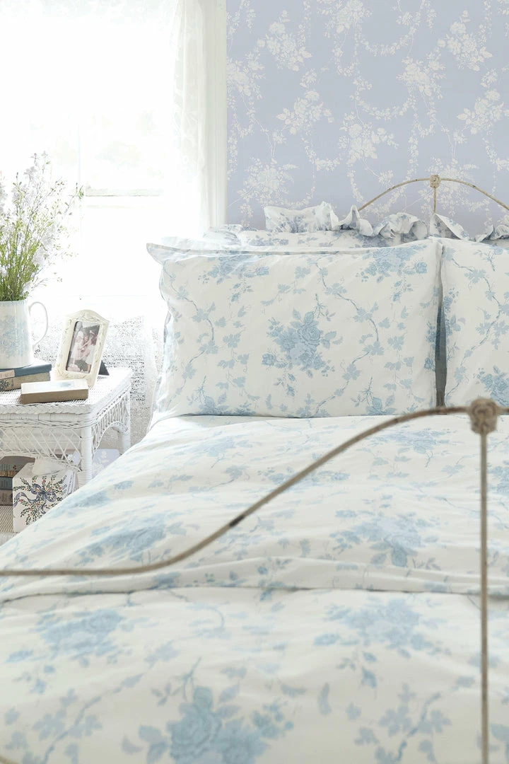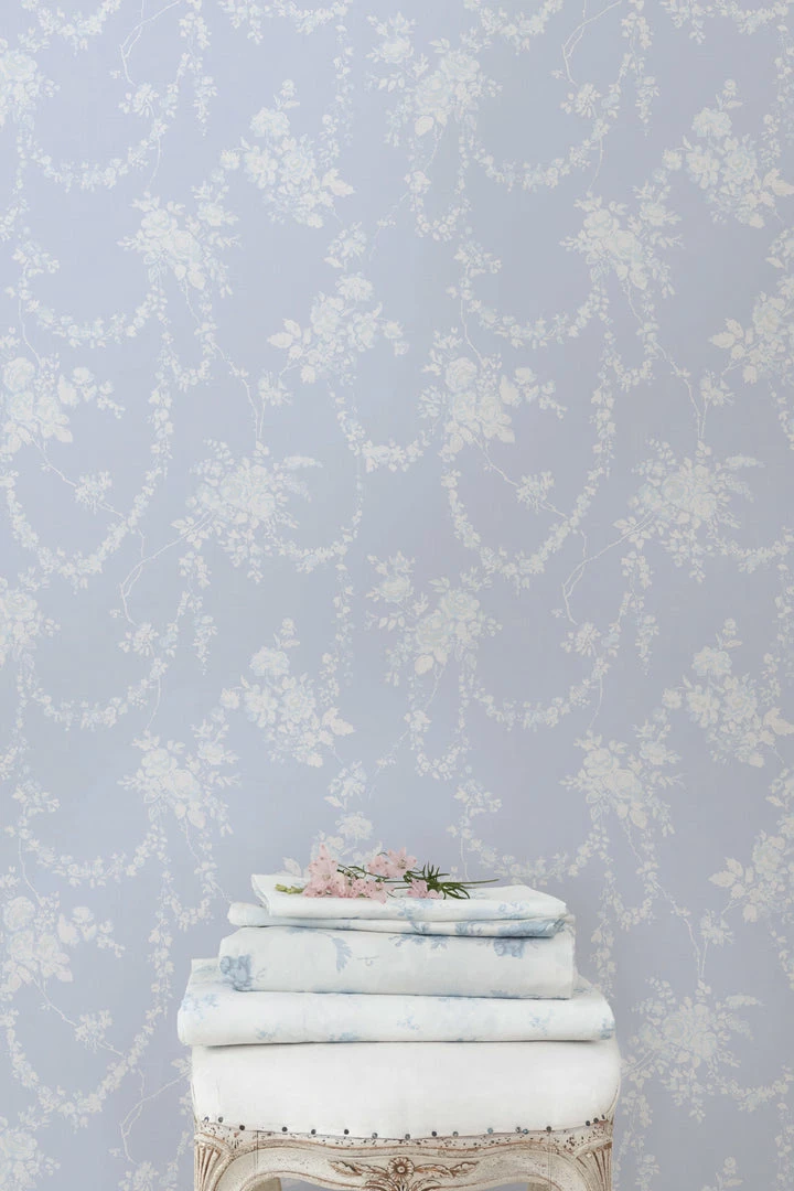 Bring elegance and enchantment to your walls with this romantic botanical wallpaper. Delicate drapes of flowering garland are anchored by voluminous rose clusters, all detailed in shades of white, grey and blue against a baby blue backdrop. Each roll measures 20.5” x 33′. Mix and match it with our La Vie En Rose Quilted Duvet Cover & Sham Set. Shown here in Blue Gemstone.