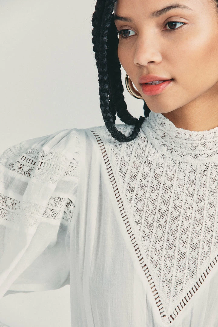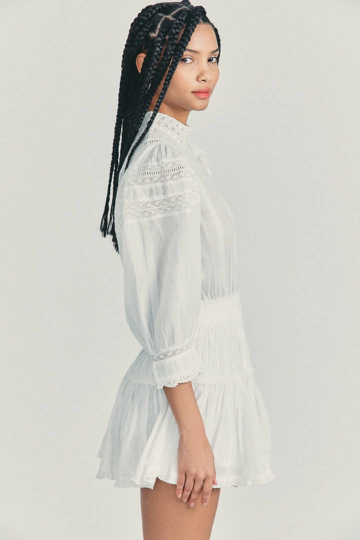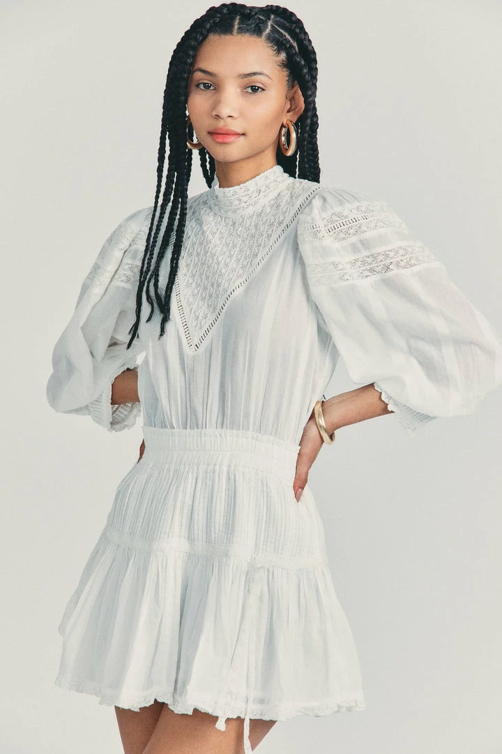 Our Victorian-inspired Viola Dress arrives in custom dobby cotton with inset floral lace and lofty wildflower embroidery. This relaxed frock has a high collar and an inset triangular lace yoke above an elastic waist. A hidden placket with center buttons lines the back. Shirred elbow-length puffed sleeves are finished with a pintucked cuff, mirrored by pintucking at the top panel of the miniskirt. Shown here in Antique White. Accessorize your mini with our LoveShackFancy x Lova Dolce Vita Heart Flower Earrings.Â