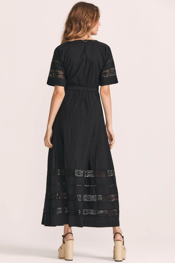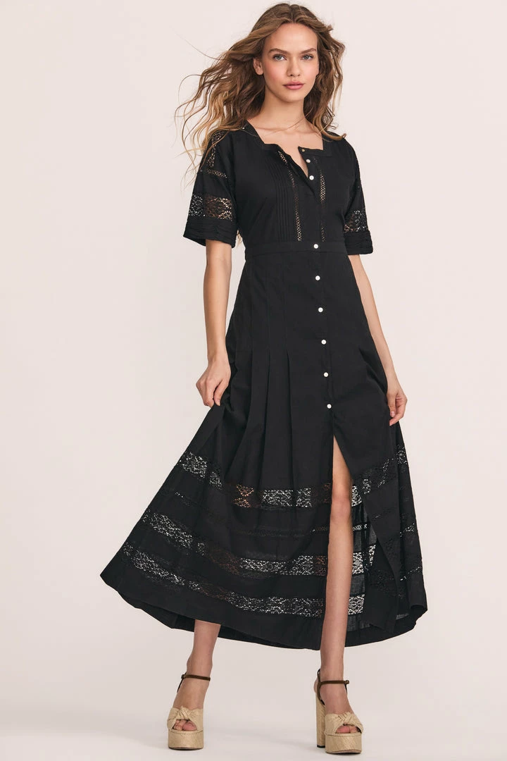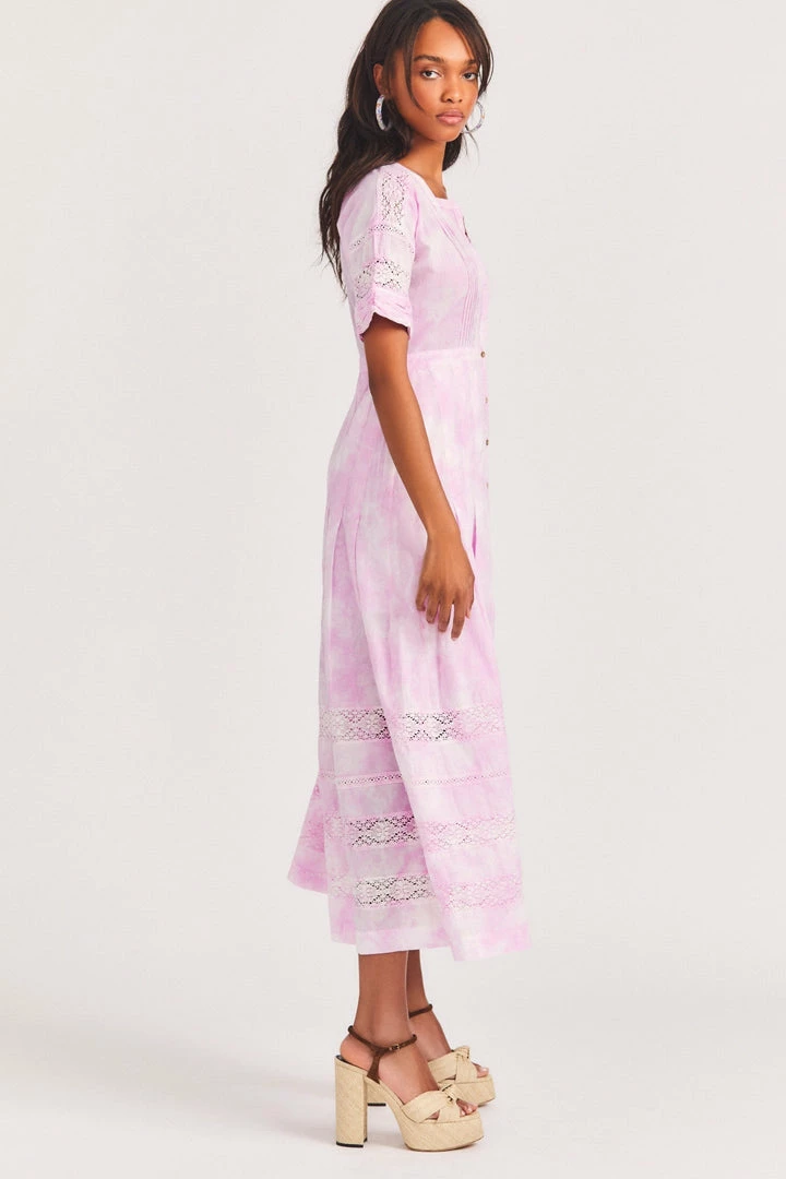 The Edie dress in cotton crochet lace features design details including an empire waist with soft pleating down to a midi-length hem. Mother of pearls buttons kiss in front from its high neckline down, while lace details adorn the sleeves and bodice. Style with black ankle strap flats, and wear it every day. Comes with a half-slip. Accessorize your Edie Midi Dress with our LoveShackFancy x Lova Dolce Vita Heart Flower Earrings.