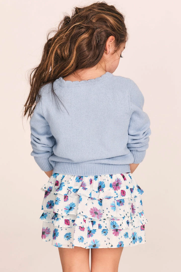 Our Billie Skirt is reimagined with a scaled polkadot print and custom embroidered lace details. Below a wide smocked waistband, the skirt falls to two shirred tiers with ruffle details. Pair this with our Girls Roger Pullover. Shown here in Deep Cotton Candy.