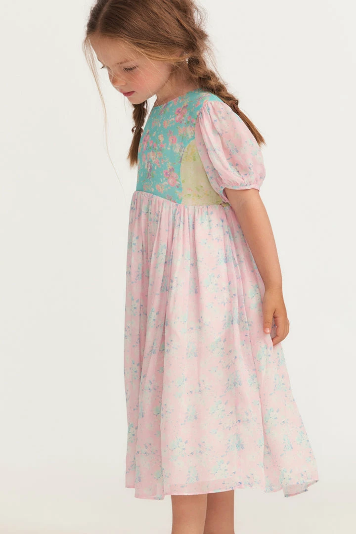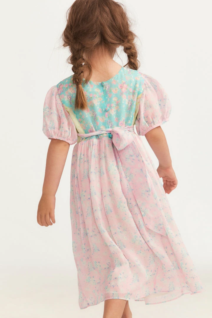 This season, our beloved Holly Dress returns in viscose with a neon floral print. This darling style for little girls showcases a puffed sleeve and shirring at the waist above a full, tea-length skirt. Fabric-covered buttons line the bodice and a sash ties at the back or front. Shown here in Fuji Sunrise Print Mix.