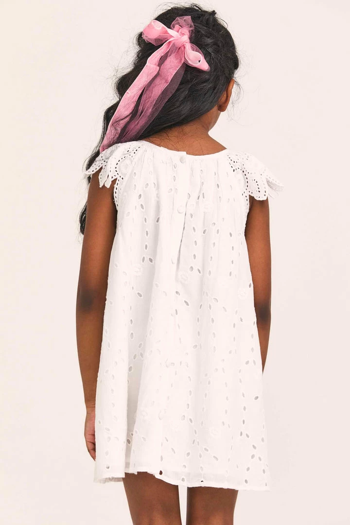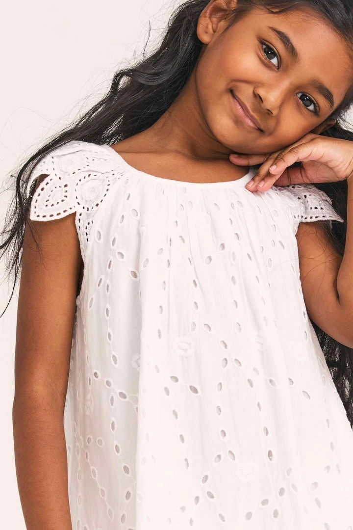 Skip along in our signature Lou Dress, reimagined in 100% cotton with custom lace and hand-embroidery. A simple shirred circle neck is framed by flutter sleeves. This sheath dress, which features buttons down center back, stops just above the knee. Accessorize it with our LSF x Lele Sadoughi Girls Pearl Headband. Shown here in Antique White.