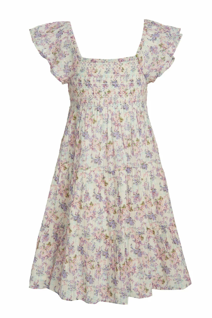 New to the season, our Malinda Mini Dress debuts in a light purple floral print.åÊIts square neckline can be worn on- or -off- the shoulder, framed by flutter sleeves. The bodice features contrast smocking to an empire waist, then falls effortlessly to a single flounce at bottom. Shown here in Positano Blue.