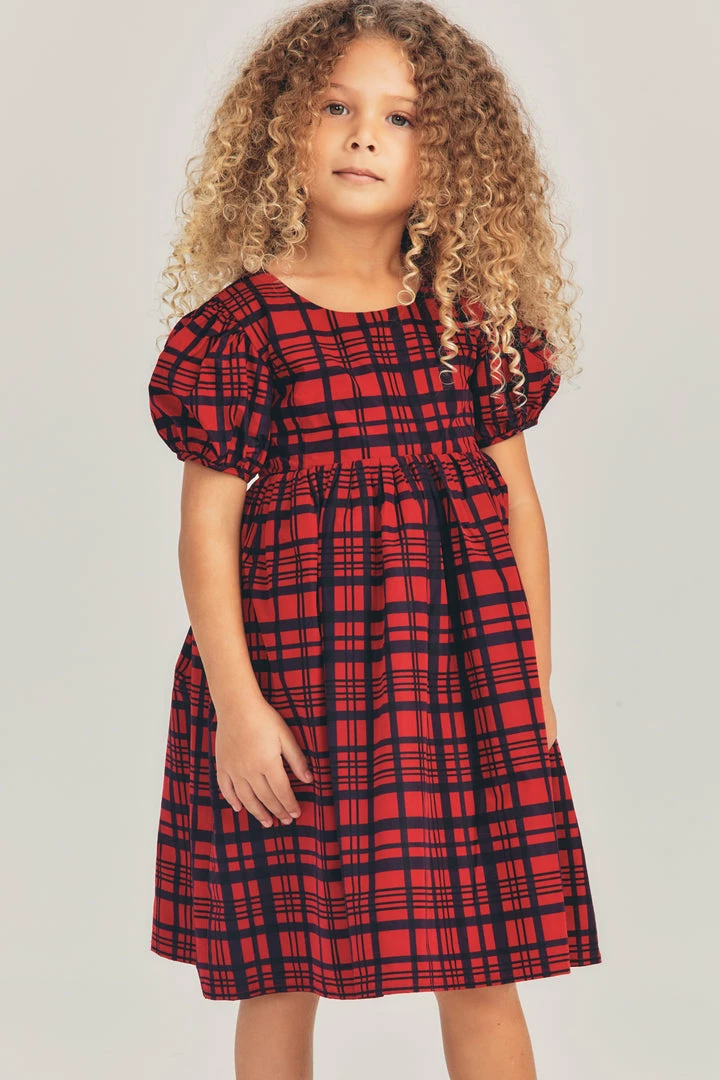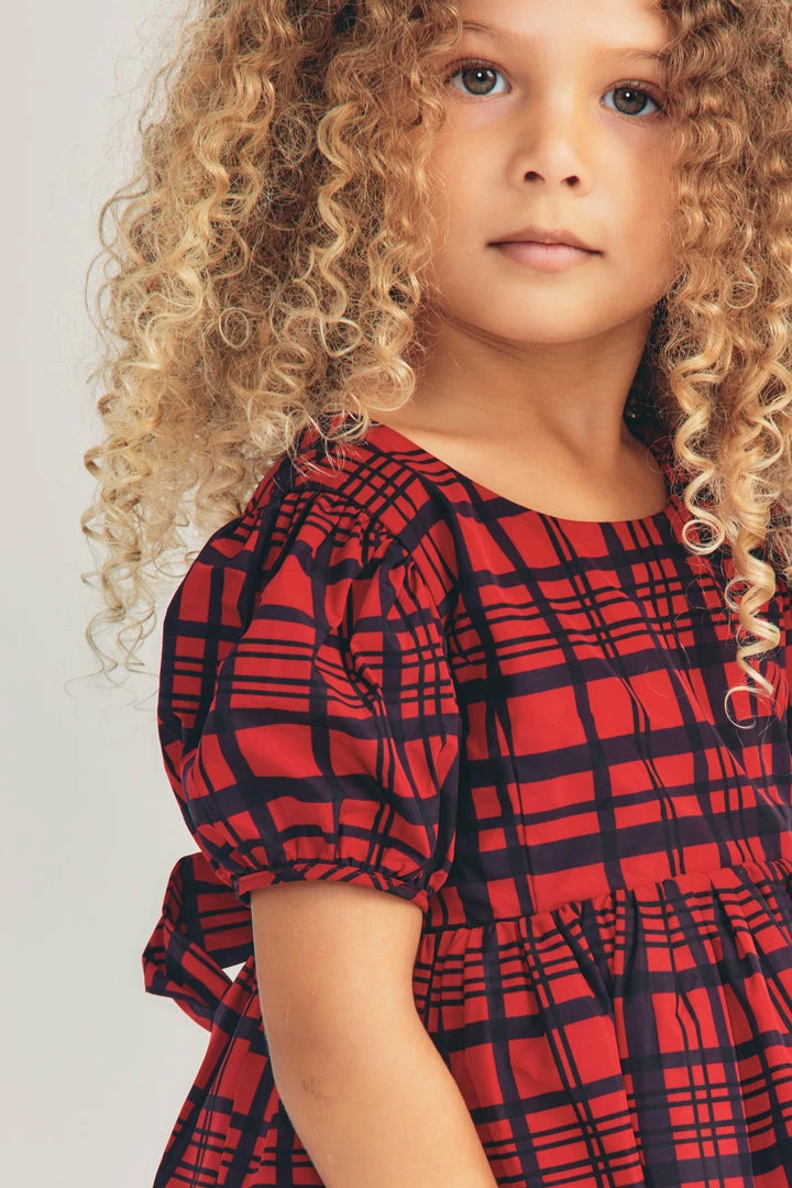This season, our beloved Holly Dress returns in taffeta with a signature holiday plaid print. This darling style for little girls showcases a puffed sleeve and shirring at the waist above a full, tea-length skirt. Fabric-covered buttons line the bodice and a sash ties at the back or front. Shown here in Moody Ruby.