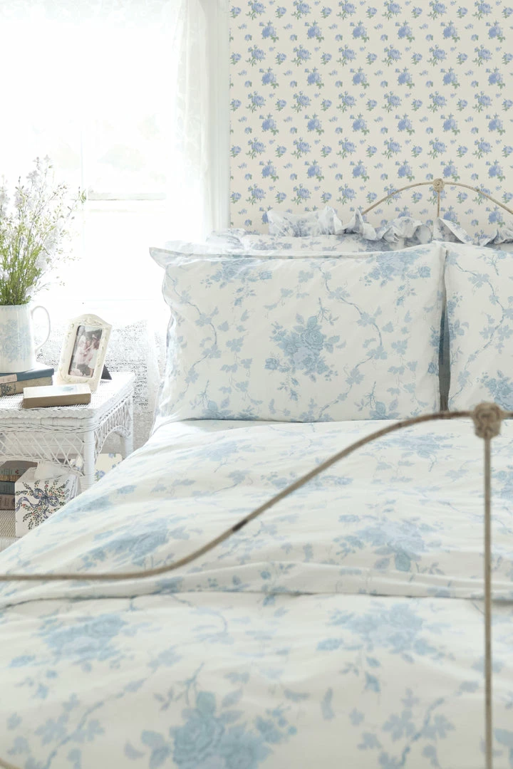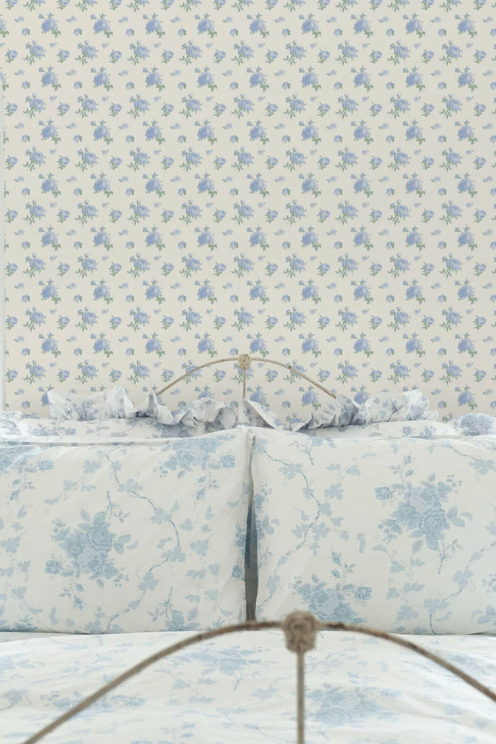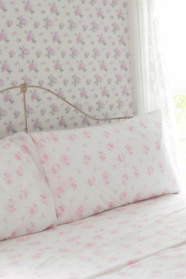 Inspired by ikat fabric, this floral wallpaper brings romantic elegance to your interiors. The pink roses and green leaves are seemingly stitched into the creamy white backdrop. Each roll measures 20.5” x 33′. Mix and match with our Pastiche De Bouquet Sheet Set and our La Vie En Rose Quilted Duvet Cover & Sham Set. Shown here in Tinted Petals.