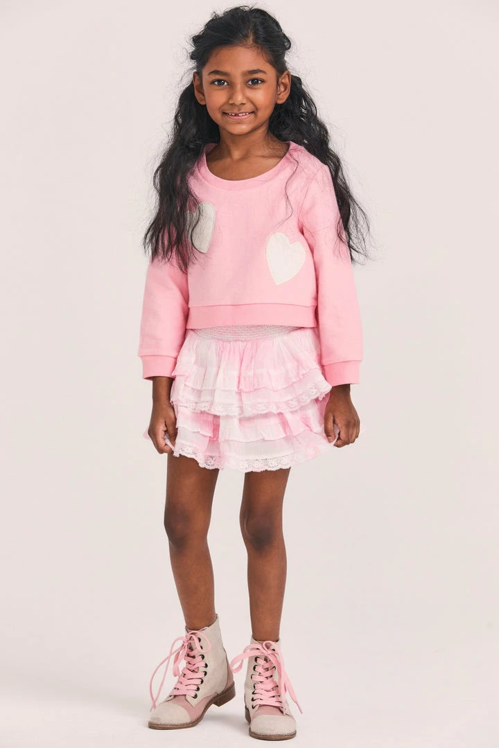 Our Billie Skirt is reimagines in naturally hand-dyed cotton with inset floral lace. Below a wide smocked waistband, the skirt falls to two shirred tiers with ruffle details. Wear it with our Girls Burkley Pullover. Shown here in Island Pink Natural Hand Dye.