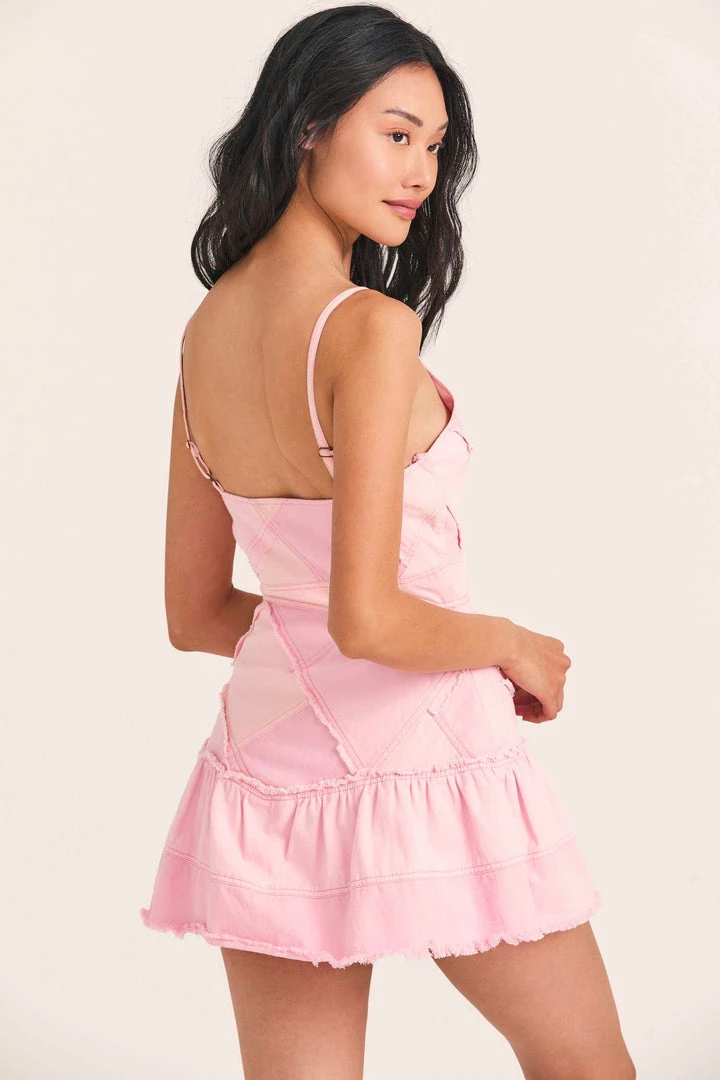 Our new Pera Dress is perfect in buttery soft denim patchwork with tonal pink color-blocking and reversed raw seams. This minidress has adjustable spaghetti straps, a v-neck, a shaped waistband and a fit-and-flare skirt with a raw-edged hem. Pair it with our Leonel Cardigan. Shown here in Pastel Pink Colorblock.