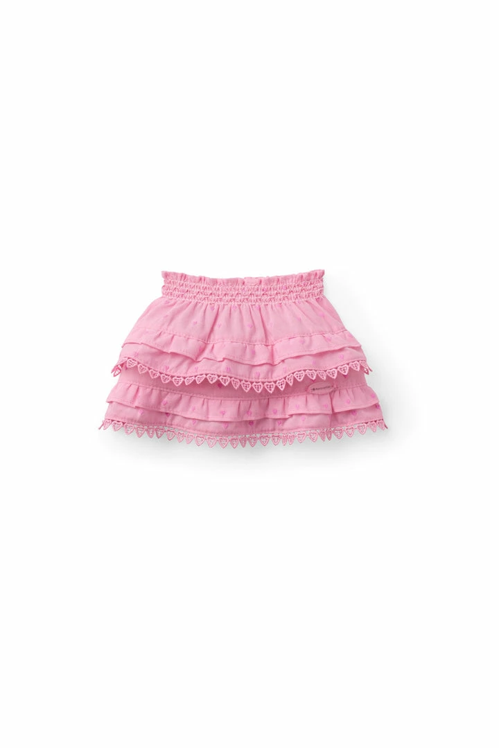 Our beloved Billie Skirt for your American Girl Doll is reimagined in 100% cotton voile with a mini heart print and custom-lace embroidered trim. Below a wide smocked waistband, the skirt falls to two shirred tiers with ruffle details. Shown here in Tutu Pink.