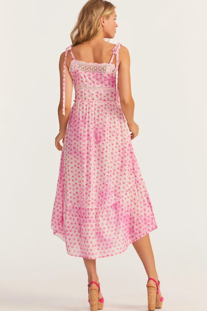 Flowing through the season in our new Carlyle Dress. This easy maxi has a relaxed waist with functional ties at the shoulder and buttons adorning the center front. Features include custom lacing and floral embroidery for a sweet finish. Wear as a coverup over our Harbor Bikini Set. Shown here in Pink Divine.