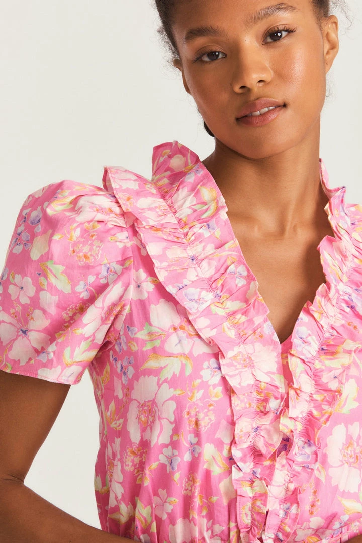 Flaunting a flouncy new silhouette in our Ellis Dress. With top applied ruffle detailing around the neck, exaggerated length ruffle, and a classic ruffle mini skirt, this mini is a dream. Featuring a center front pinch detail and encased elastic short sleeves for a charming figure. Accessorize this with our Hessel Cat Eye Sunglasses. Shown here in Pink Party Bash.