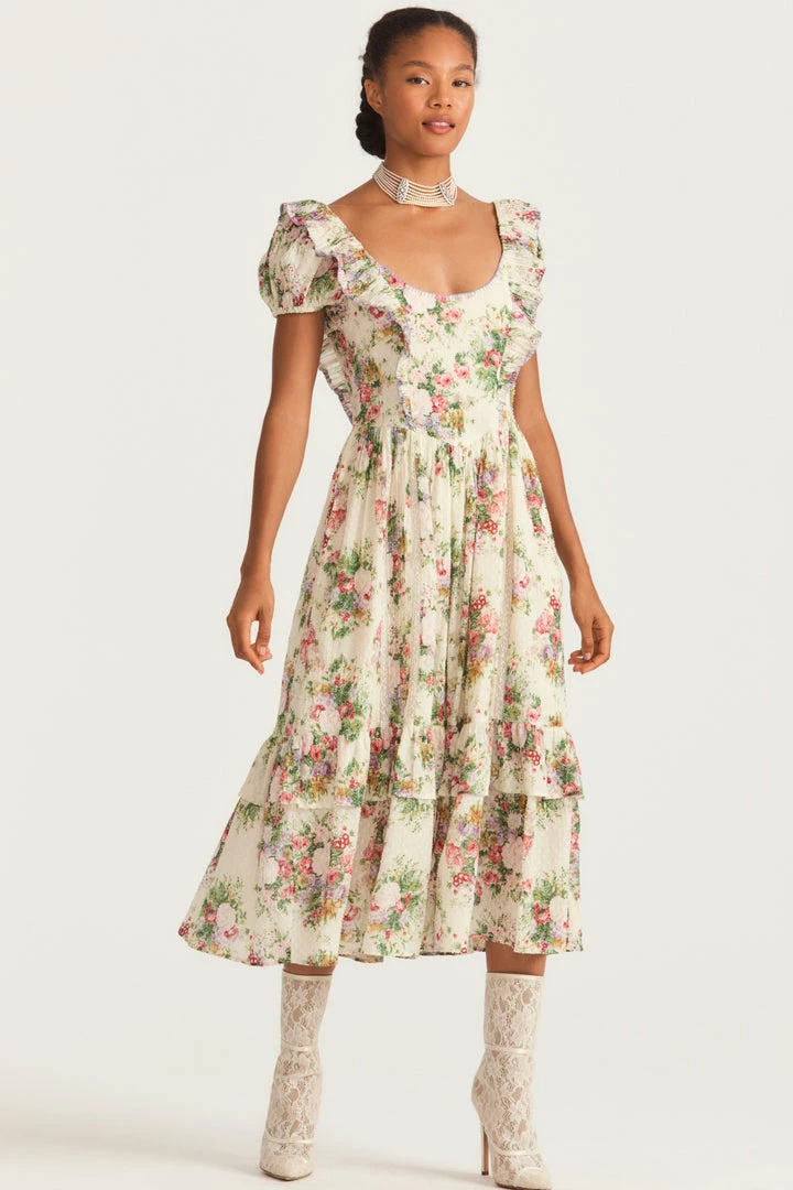 Introducing the Exley Dress, an update to a LoveShackFancy favorite, the Chessey Dress. This whimsical maxi arrives in 100% cotton in our hero print of the season ; a French textile-inspired floral Victorian, a favorite of our Creative Director’s Rebecca Hessel Cohen. With our signature smocking detail, she stuns with custom laces, short puff sleeve, side seam pockets, and princess seam ruffle detail. Accessorize it with our Cornwall Fields Scrunchies. Shown here in Shining Gemstone.