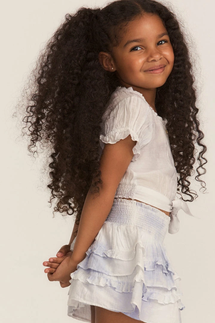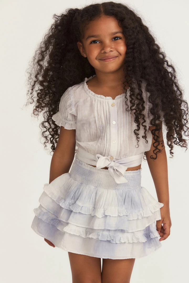 This darling cotton blouse blossoms in a subtle heather blue hand dye. With a ruffled, circle neck and matching short sleeves, this blouse is shirred with buttons down center front and a sweet wrap-around bow that ties around the waist. Pair it with our Girls Billie Skirt. Shown here in Heather Blue Hand Dye.