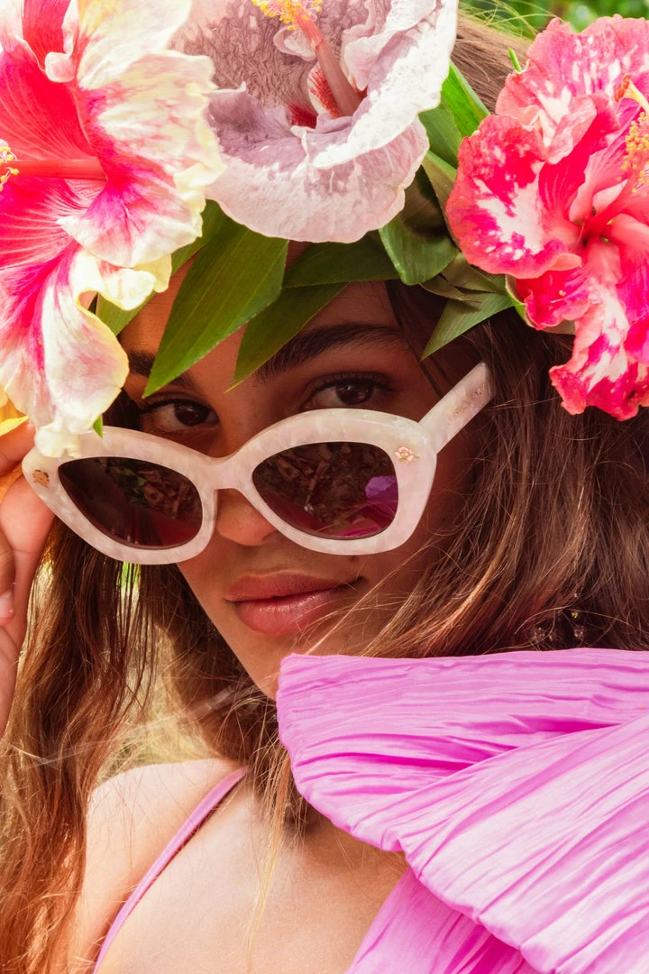Having a dream girl moment in our Hessel sunglasses. These modern, round cat eye frames add a glossy finish to any look. Wear them with our Tibbie Swimsuit.Â