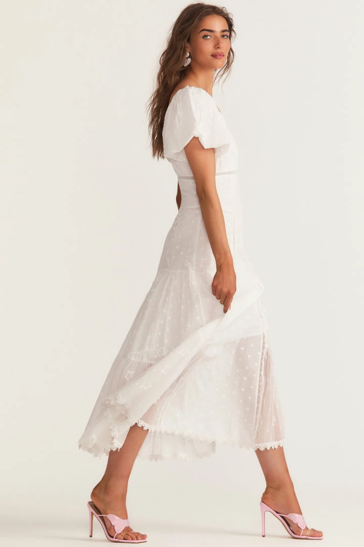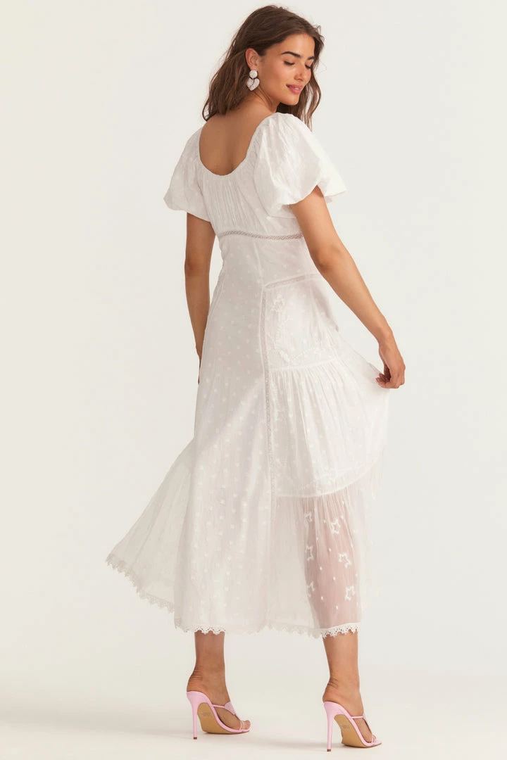 Strolling in our Jivera Dress in 100% cotton with crinkle chiffon detailing throughout. With elastic around the neck, this midi dress makes a bold statement with an exaggerated sleeve and slim fit followed by an amplified sweep. The dress falls with pretty seams and paneling featuring intricate embroidered lacing framing the body finished with a large panel of crinkle chiffon at the hem. Accessorize it with our LSF x Sophia Webster Alba Mid Sandal. Shown here in White.