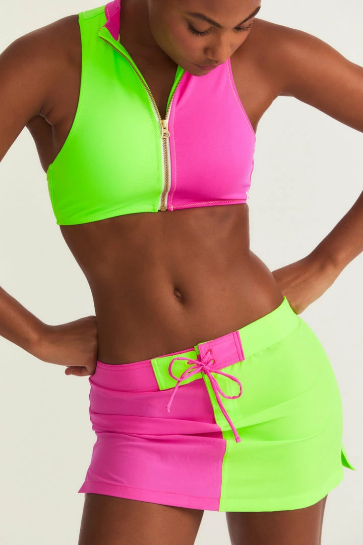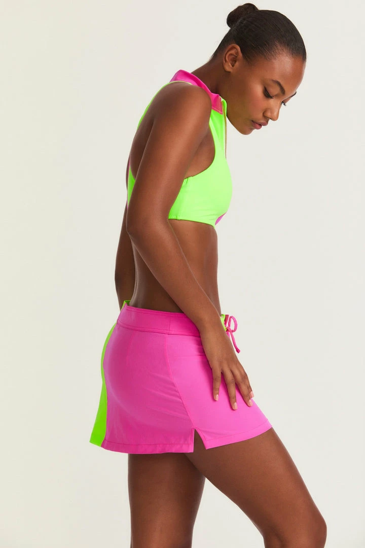 Summer day dreams come true with our new LoveShackFancy x Hurley Boardie Skirt. This breezy, two-tiered mini is as fun as can be with neon color blocking. Pair it with our LoveShackFancy x Hurley Bow Back Top for the ultimate beach look. Shown here in Magenta Neon Lime.