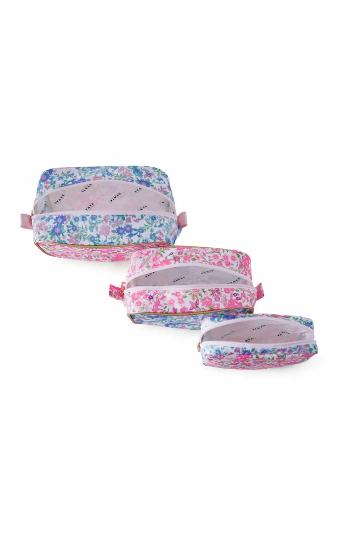 Good things come in threes; our Travel Pouch Set by LoveShackFancy x STATE includes a larger pouch, a medium size pouch, and a smaller pouch perfect for all of your different sized everyday needs. The pouches nest into one another for easy storage. A playful contrasting pink and blue floral print makes for a very complimentary set of three. Pair it with our LSF x State Logan Suitcase. Shown here in Bay Breeze Multi.