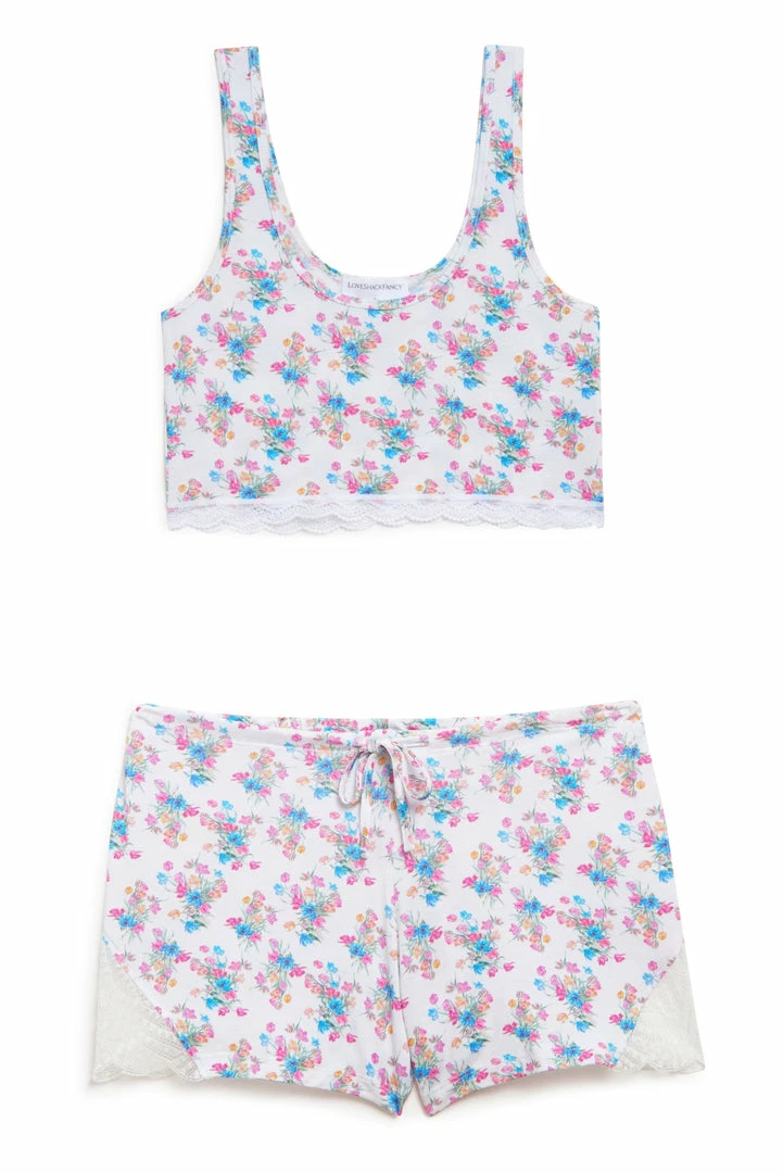 The Cabbage Rose Bow Lace Crop Top and Short Set made from ultra-soft and sustainable, TENCELâ„¢ fabric is heaven sent. A super comfy scoop neck tank with a playful rosey print paired with matching, breathable shorts. Both pieces are embellished with intricate lace detail for a romantic touch. Shown here in Cabbage Rose Bow.