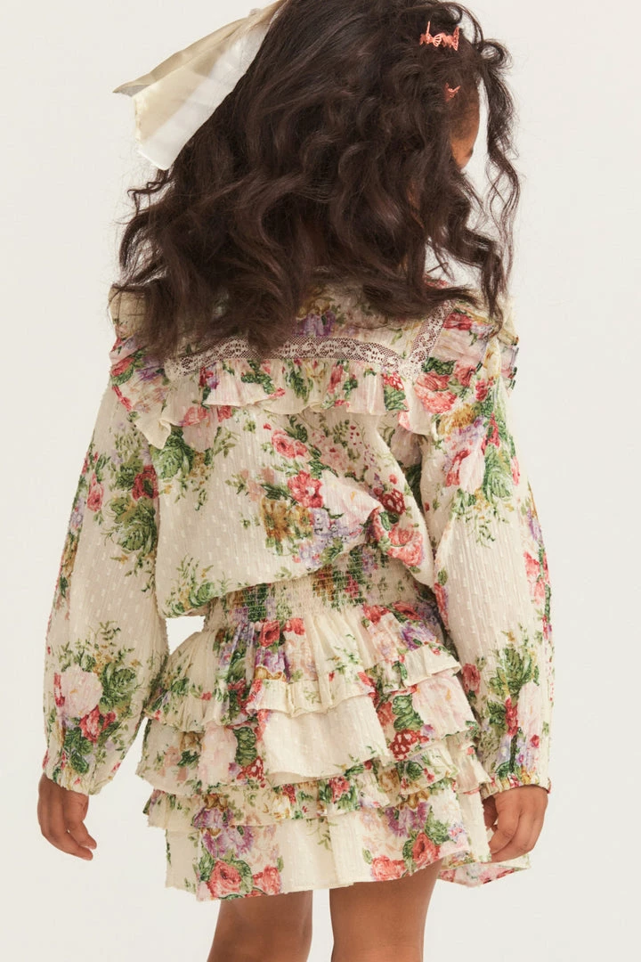 Our sweet Oda Top makes its entrance in 100% cotton in our hero print of the season ; a French textile-inspired floral Victorian, a favorite of our Creative Director’s Rebecca Hessel Cohen. This easy, transitional summer-to-fall blouse features intricate custom lace detail at the round neckline and throughout the ruffle-adorned bib, airy long sleeves and small embroidery detail all over. Complete the set with our Girls Billie Skirt.