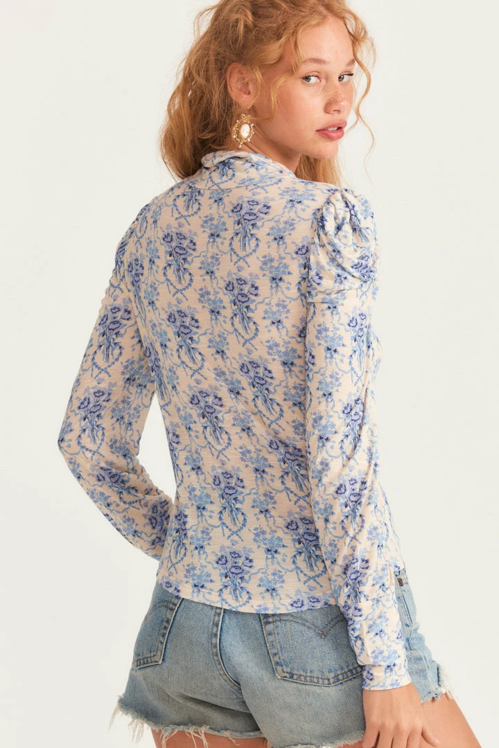 A perfect transitional fall staple, our silky Vienna Turtleneck returns in our hero print of the season, a tossed bouquet. This must-have turtleneck top, which is adorable as a layer under jumpsuits or painted with a favorite LoveShackFancy skirt, features a slim fit and shirred shaped puffed sleeves that narrow to fitted clean cuffs at opening. Pair it with our Ruffle Mini Skirt. Shown here in Frosted Shores.