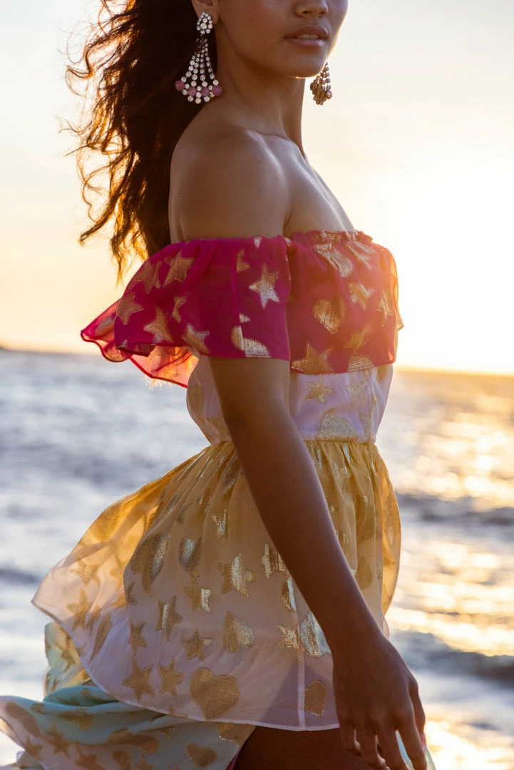 Our Vynne Maxi Dress is a moment with a multi-tier custom star and heart ombré color block print with ruffles to the floor. This off-the-shoulder dress features a flirty slit at the wearer’s right. Accessorize this with our LSF x Love Gold Flower Earrings. Shown here in Surfer Fuschia Light.